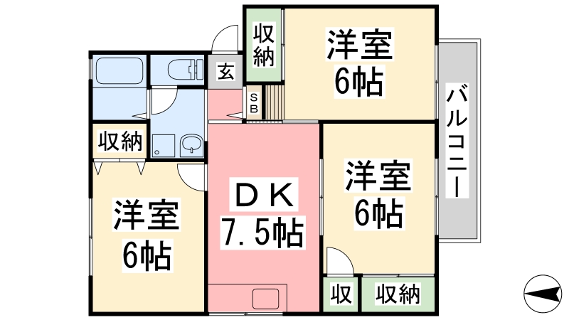 | 間取り詳細 | DK 7.5畳 、 洋室 6畳 、 洋室 6畳 、 洋室 6畳 |