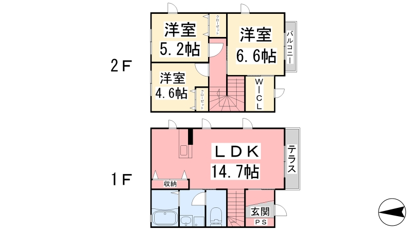 | 間取り詳細 | LDK 14.7畳 、 洋室 6.6畳 、 洋室 5.2畳 、 洋室 4.6畳 |