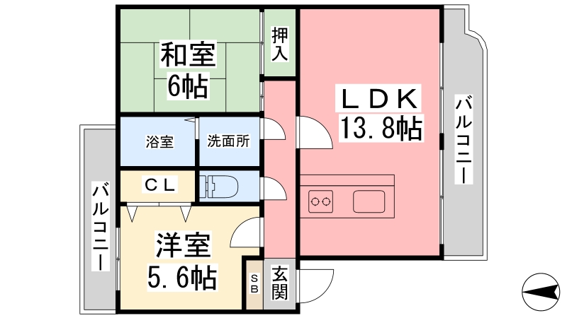 | 間取り詳細 | LDK 13.8畳 、 洋室 5.6畳 、 和室 6畳 |