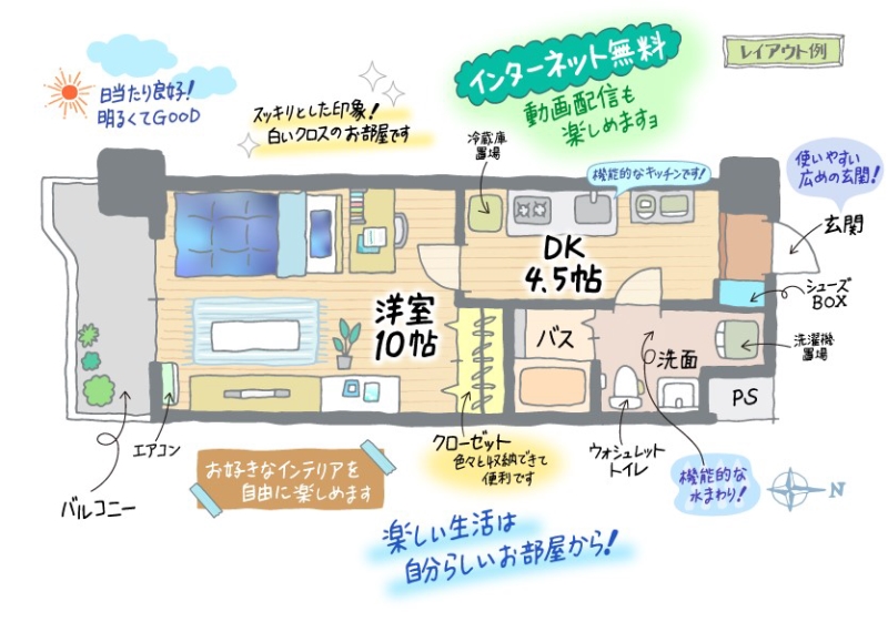 インターネット無料、浴室乾燥・追焚機能付き、南向きバルコニーで日当たり良好です。