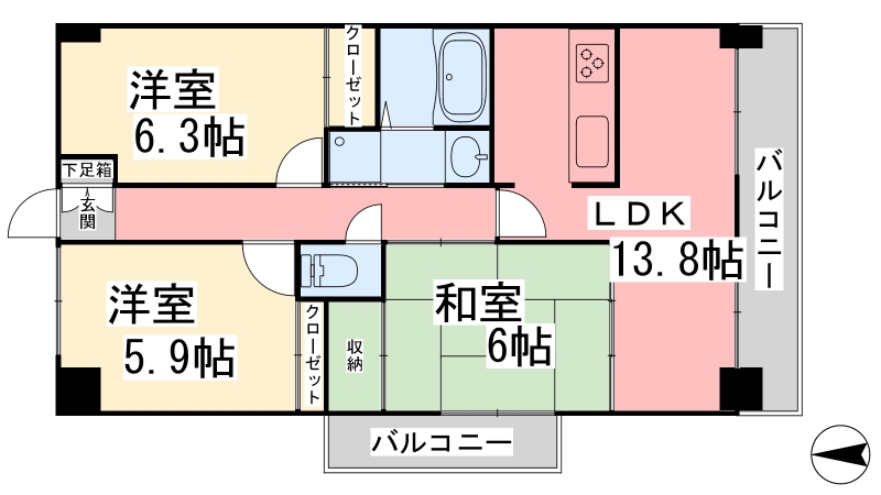 間取り詳細 | DK 13.8畳 、 洋室 6.3畳 、 洋室 5.9畳 、 和室 6畳 |