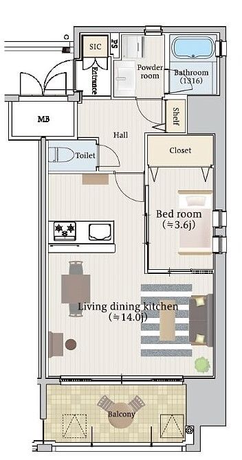 | 間取り詳細 | 洋室 3.6畳 、 LDK 14畳 |