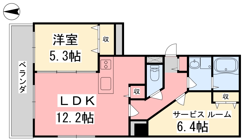 | 間取り詳細 | LDK 12.2畳 、 洋室 5.3畳 、 S 6.4畳 |