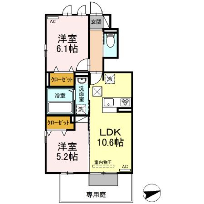 | 間取り詳細 | LDK 10.6畳 、 洋室 6.1畳 、 洋室 5.2畳 |
