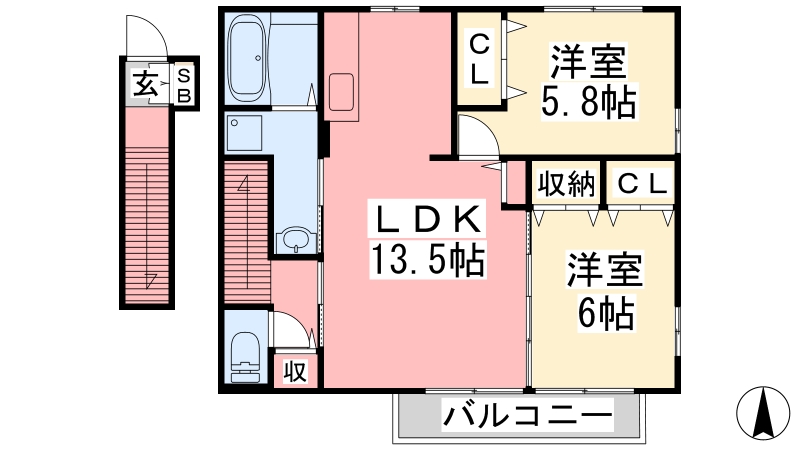 | 間取り詳細 | LDK 13.5畳 、 洋室 5.8畳 、 洋室 6畳 |