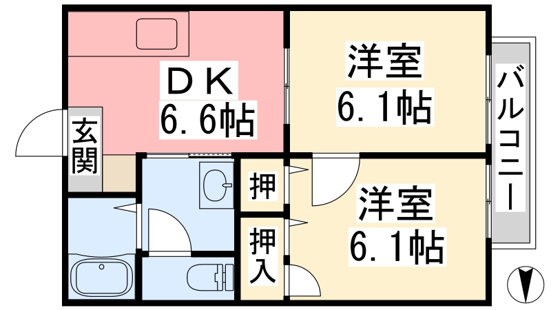 | 間取り詳細 | DK 6.6畳 、 洋室 6.1畳 、 洋室 6.1畳 |