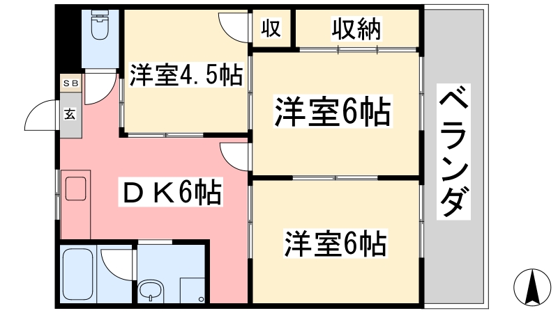 | 間取り詳細 | DK 6畳 、 洋室 4.5畳 、 洋室 6畳 、 洋室 6畳 |
