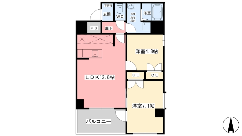 | 間取り詳細 | LDK 12.8畳 、 洋室 7.1畳 、 洋室 4.8畳 |