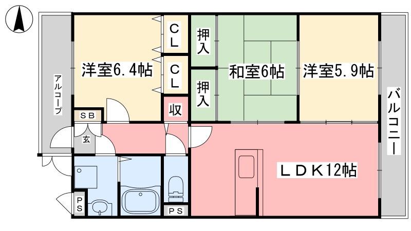 | 間取り詳細 | LDK 12畳 、 洋室 6.4畳 、 洋室 5.9畳 、 和室 6畳 |
