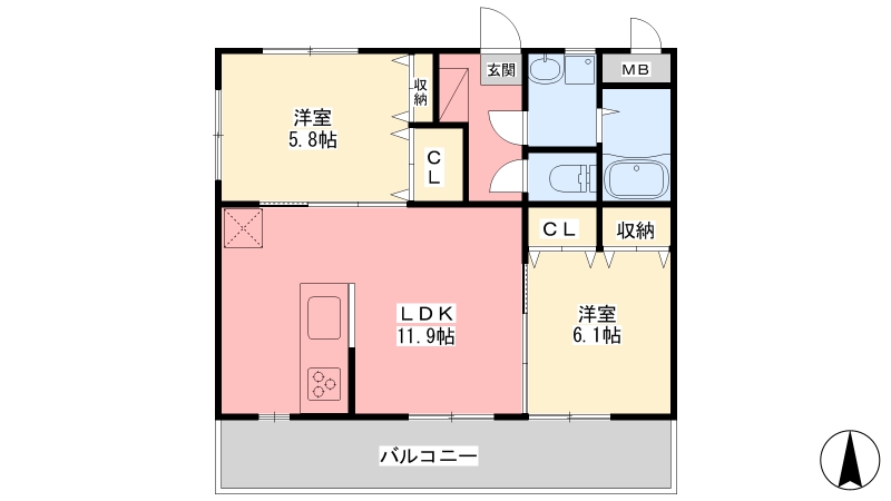 | 間取り詳細 | LDK 11.9畳 、 洋室 6.1畳 、 洋室 5.8畳 |
