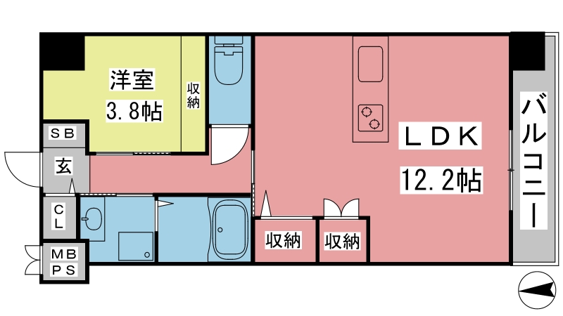 | 間取り詳細 | LDK 12.2畳 、 洋室 3.8畳 |