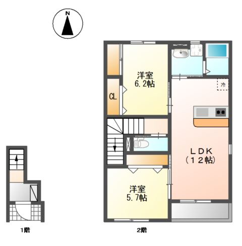 | 間取り詳細 | LDK 12畳 、 洋室 6.2畳 、 洋室 5.7畳 |