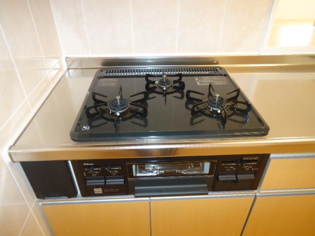 | 設備 | ガス(プロパン)、インターホン(TVモニター付き)、バイク置き場、角部屋、フローリング、ベランダ・バルコニー、バス・トイレ別(別室)、シャワー、追い焚き、浴室乾燥機、給湯、温水洗浄便座、シャンプードレッサー、洗濯機置き場(室内)、コンロ種類(プロパン)、カウンターキッチン、エアコン、BS | ||