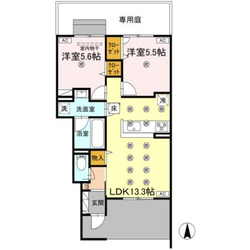 | 間取り詳細 | LDK 13.3畳 、 洋室 5.6畳 、 洋室 5.5畳 |
